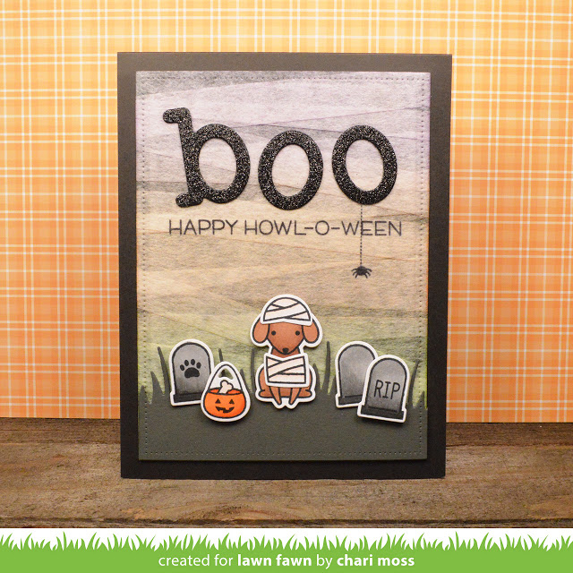 Chari made a brilliant mummy-themed Happy Howloween card! There’s a video to show how to create the background with Simple Grassy Hillside Borders and Spooktacular accents. The glittery letters are Louie’s ABCs!