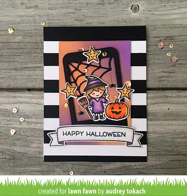 The wide stripes in black and white in the background make Audrey‘s Costume Party/Cute Cobweb card an instant classic!
