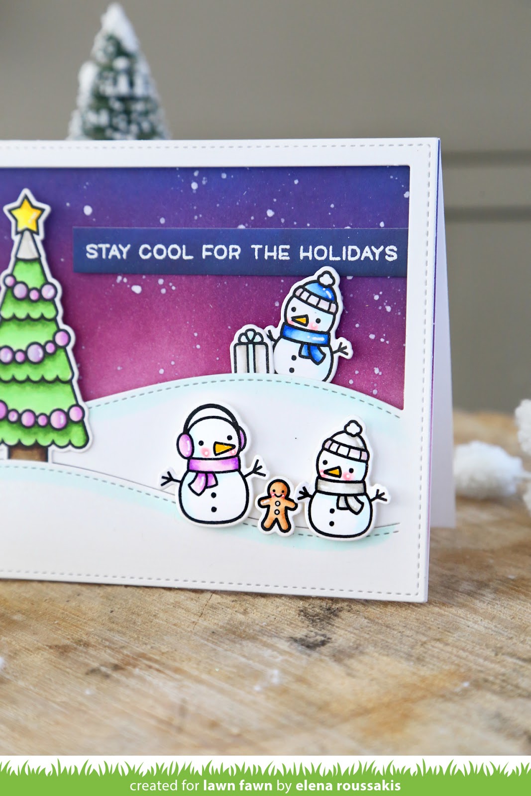 Elena created a dramatic night sky for her sweet holiday card! Stitched Hillside Backdrop: Landscape sets the scene the cute Ready Set Snow snowmen and tree from Christmas Dreams!
