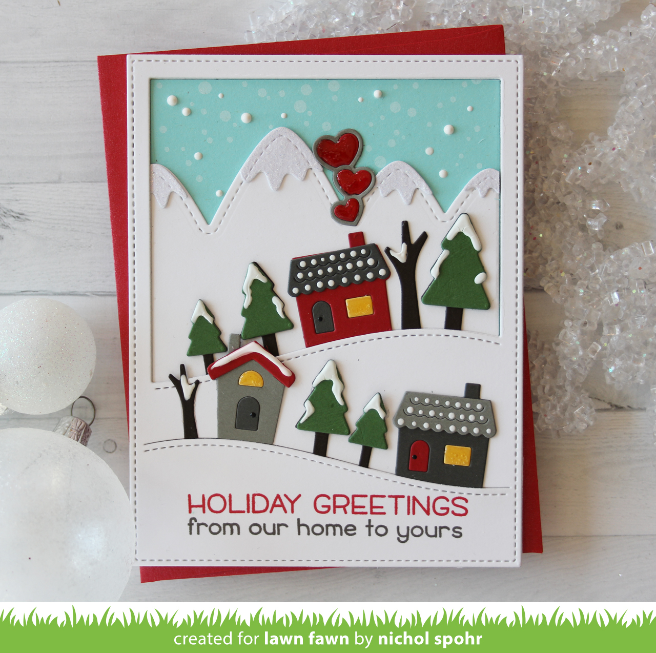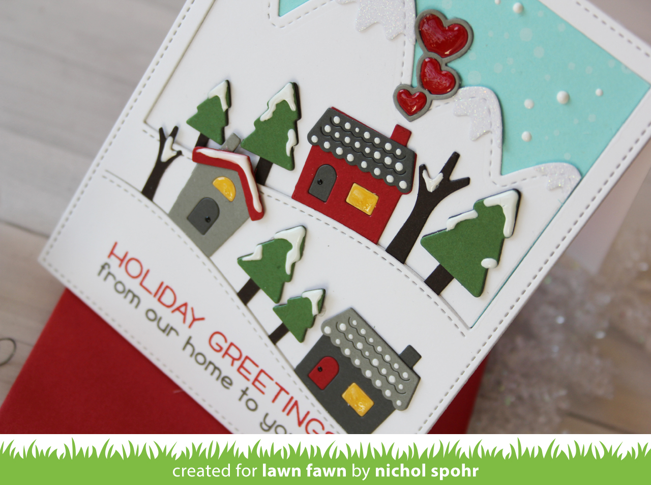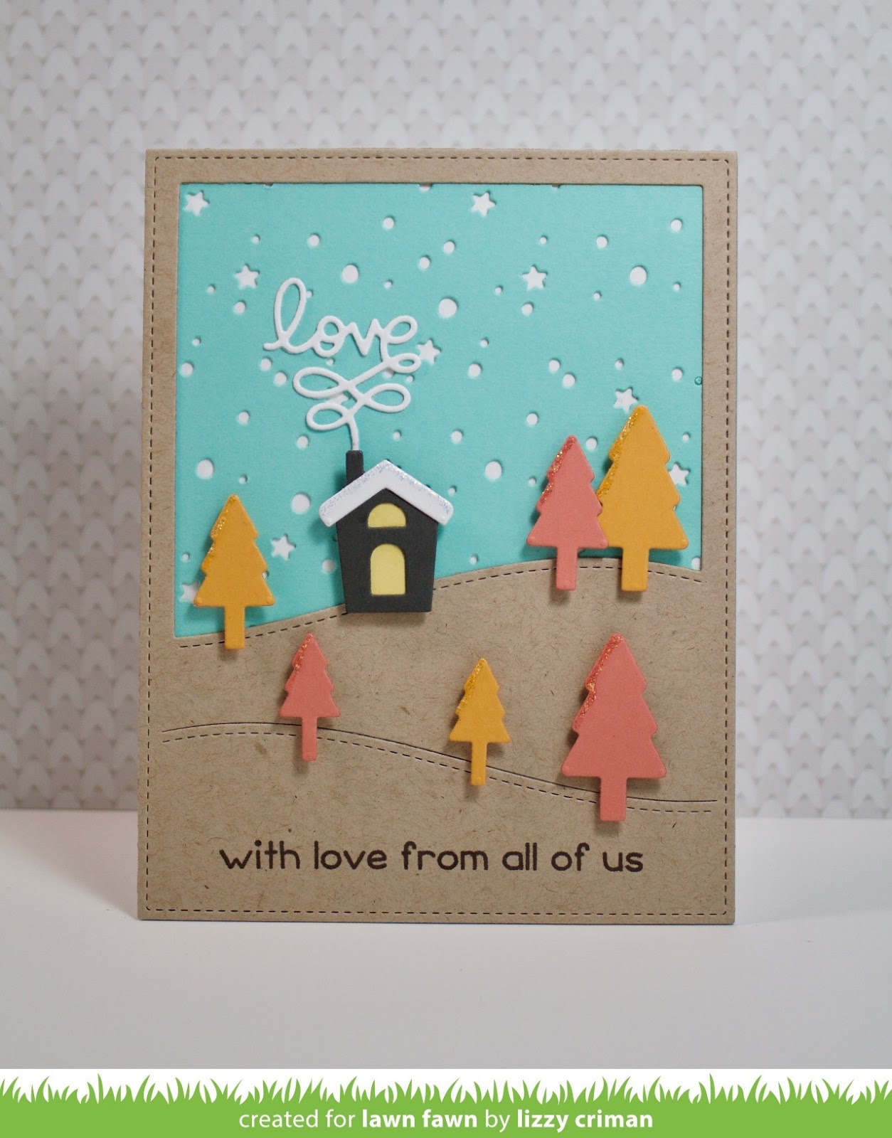 I love Lizzy‘s fun color combo with the Stitched Hillside Backdrop die cut from kraft cardstock! The sweet sentiment is from Winter Village!