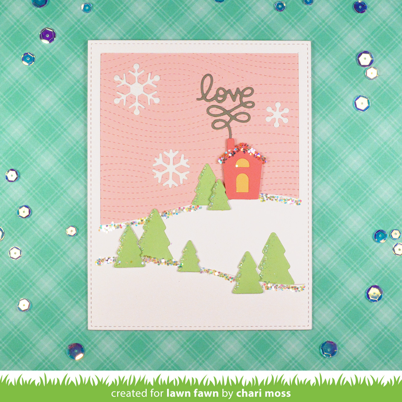 Chari used all the elements in Stitched Hillside Backdrop: Portrait to create a lovely card! She added texture to the “sky” with Stitched Woodgrain Backdrop and some Mini Snowflakes! Chunky Glitter provides a bit of sparkle!