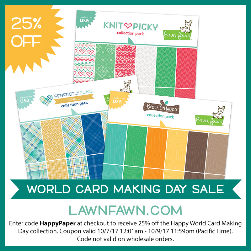 Happy World Card Making Day everyone! In honor of this day when we celebrate our wonderful card making hobby we have a sale at lawnfawn.com on our brand new paper collections: Knit Picky, Knock on Wood and Perfectly Plaid Chill!