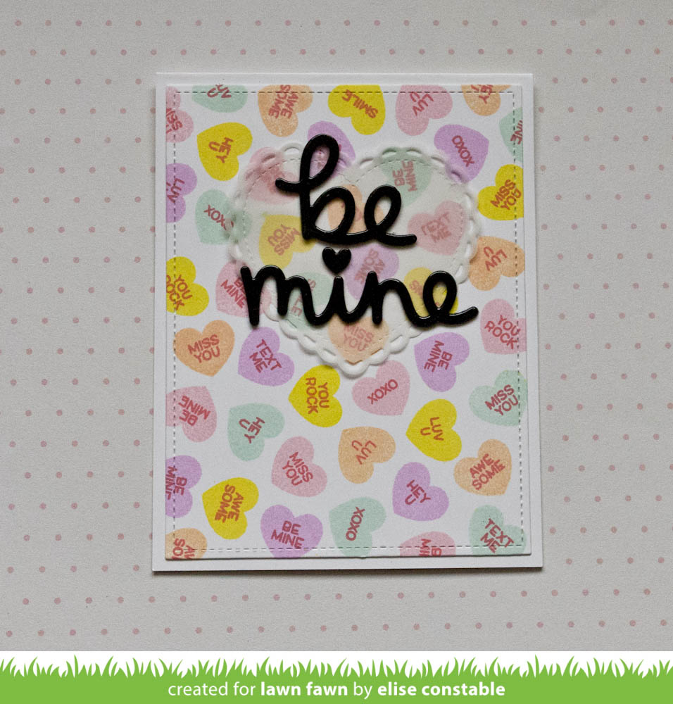 Elise used the solid conversation heart included in this new set to stamp an all-over design on the background of her pretty Valentine card! She included our 2 new ink colors; can you guess which ones they are? I love the glossy look of the Scripty greeting!