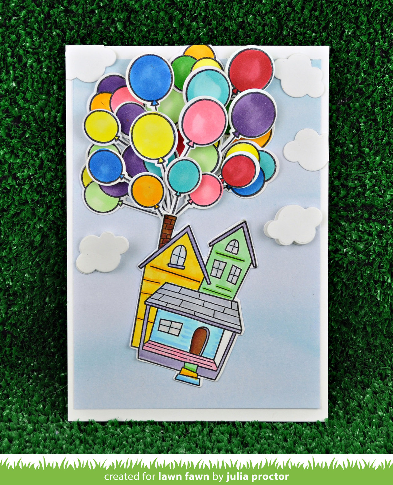 It’s time to share a card by another of our Lawn Fawn HQ Fawnies! Julia was inspired by the movie Up to create a cute “up-lifting” card! She used the house from Happy Haunting and balloons from lots of different sets!