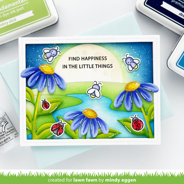 With bubbles from Ocean Shell-fie, and a sentiment from Mermaid for You, these ocean critters are “waving hello”! Franci inked the top half of the card, then stenciled it with Lots of Hearts Background Stencils.