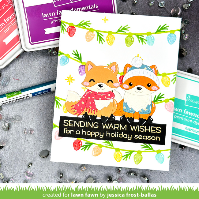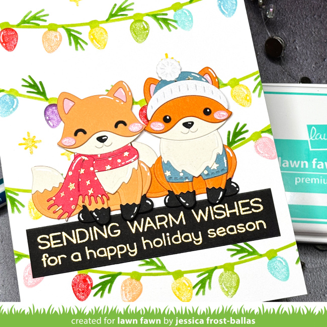 I love the cheerful colors that Jessica chose to stencil the String of Lights! It looks so pretty on the white background. And the Merry Messages greeting is a standout gold embossed on black!