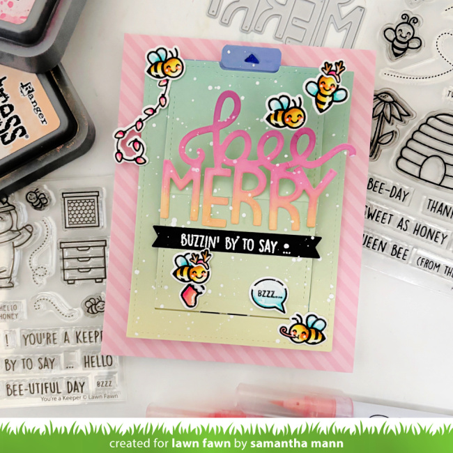 For this beekeeping themed card, Samantha got really creative and altered Giant Be Merry, adding an extra “e” to keep with the bee theme!