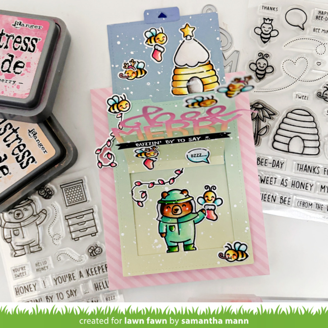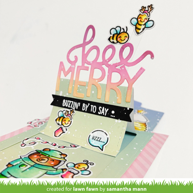 Samantha has a clever Pull ‘n Slide Surprise card to share with you today! It’s a hive of holiday fun with a punny alteration to Giant Be Merry! You can watch the video tutorial below or click HERE to watch at our YouTube channel.