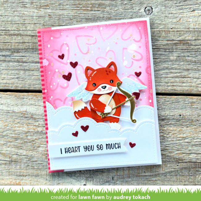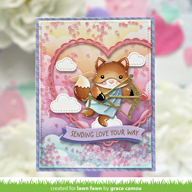 Grace‘s card is so fantastic! From the colorful stenciled clouds and offset Lacy Heart to the shaker design, it’s the perfect way to send love with our adorable Build-A-Fox and Build-A-Critter Valentine Accessories!
