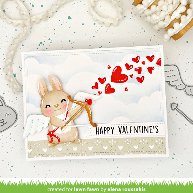 Elena‘s Valentine card is so dreamy set in the stenciled clouds! Her cute Build-A-Bunny cupid is anchored on a Quilted Heart Border as he sends off lots of pretty red hearts!