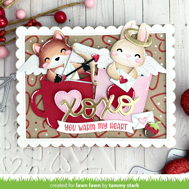 Do you remember Tammy‘s Halloween and holiday critters in the Build-A-Drink Mug Add-On? Now she shows us that the idea is also perfect for Valentine’s Day! She filled the mugs with Build-A-Fox and Build-A-Bunny dressed as cupid and an angel to send lots of love! There’s Outline Hearts stenciled in the background, Scripty XOXO and a Henry’s ABCs “halo”!