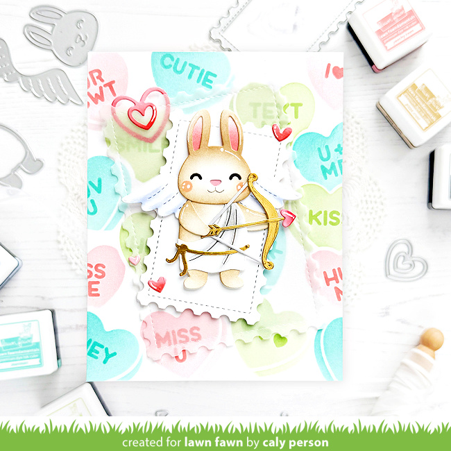 In addition to our cute Build-A-Bunny dressed in the Build-A-Critter Valentine Accessories, Caly also included lots of new goodies in her amazing design! She created the background with Candy Hearts Stencils, then she layered Postage Rectangle Stackables in white and vellum. And then she used our new Paper Clips to add a cute heart-shaped paper clip! So perfect!