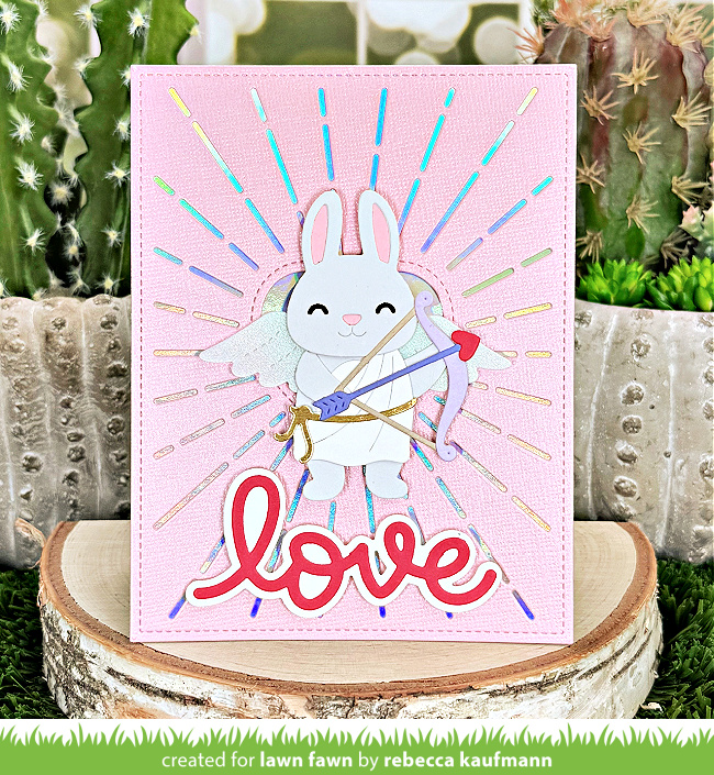 Rebecca designed a colorful backdrop for our cute Build-A-Bunny cupid! She layered a pink Radiant Heart Backdrop over a panel of holographic cardstock to feature the cute critter. Then she added a die cut greeting with Scripty Love and Scripty Love Outline Add-On!