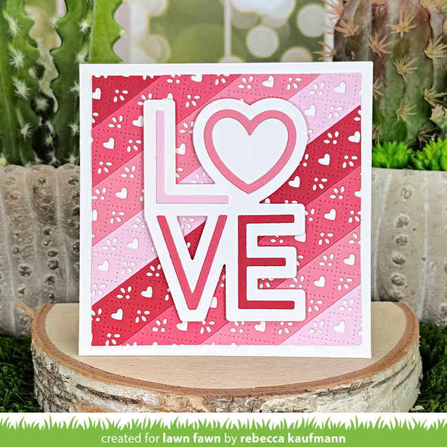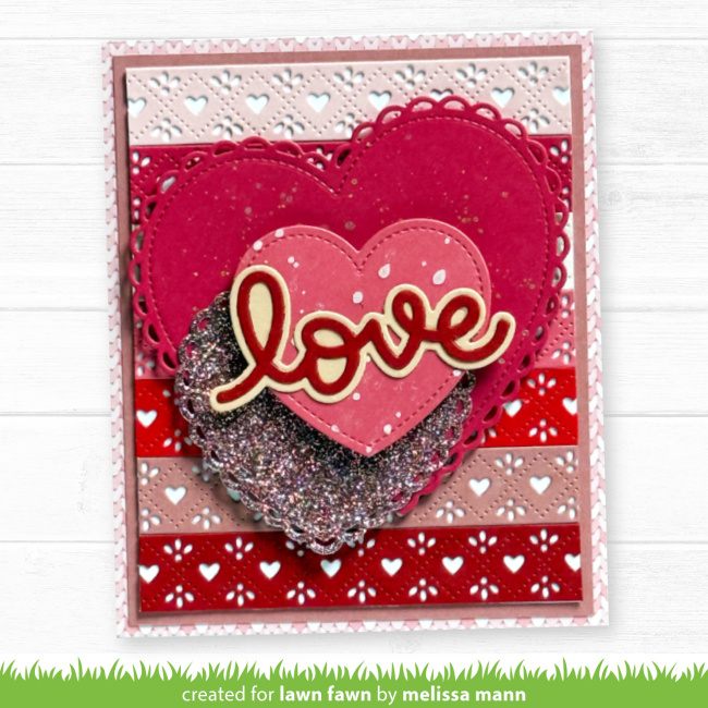 Lynnette created a traditional style Valentine filled with hearts and so much love! She cleverly framed Quilted Heart Borders in shades of red with a Heart Stackables cut out. All that is left is the Scripty Love greeting on a Scripty Love Outline Add-On.