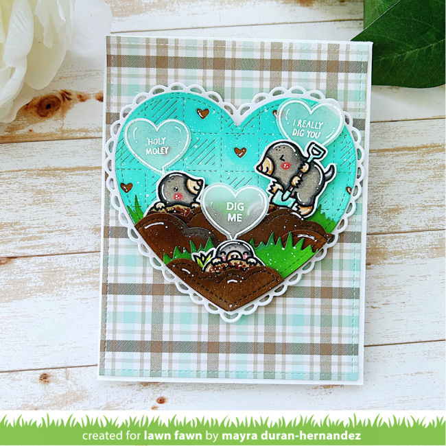 For her card, Mayra combined a trio of the cutest new critters from A Mole Lot of Love. They are busy digging in a garden plot made with Puffy Cloud Borders and Mushroom Border. In the background she cut an Outside In Stitched Heart from Mermaid cardstock previously cut with Checkered Hearts Backdrop. Then she layered this heart on a Lacy Heart Stackables. I love how she white embossed the cute sayings on the vellum heart-shaped speech bubbles.