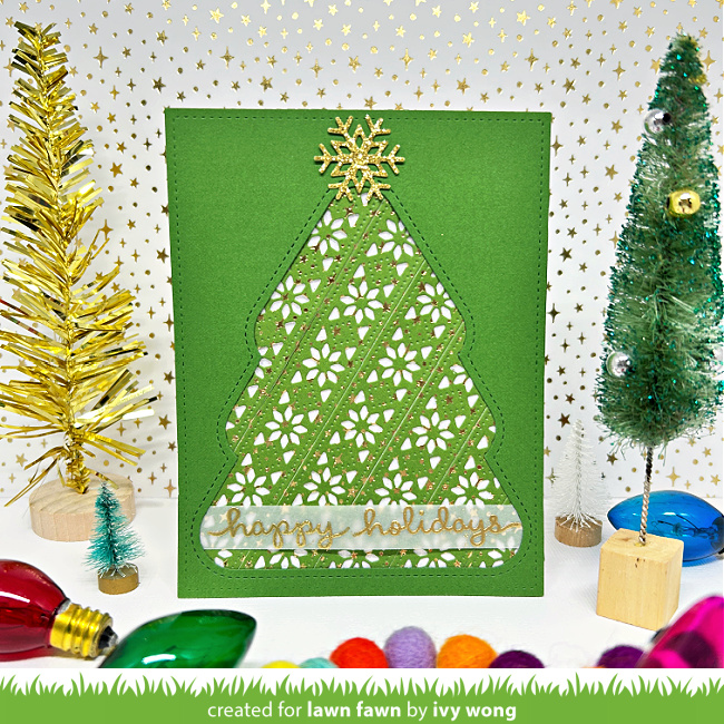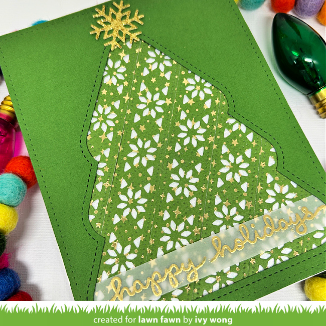 Next, Ivy brought in more sparkly gold accents to coordinate with the gold foiled paper. She added a Mini Snowflake in Gold Sparkle cardstock to the top of the tree. Then she stamped and gold embossed a holiday sentiment from Toboggan Together on a vellum sentiment banner, tucking it inside the tree shape.