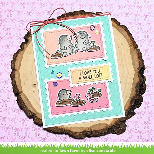 Elise‘s card with A Mole Lot of Love is so cute! She arranged the adorable images in scenes on Outside In Stitched Rectangle Stackables. Then she used the new Postage Rectangle Stackables to add a frame to the little scenes. She carried that design to the sentiment and layered them all on a Gleeful Gradients panel. And then she finished the card with a Coral Hemp Twine bow!