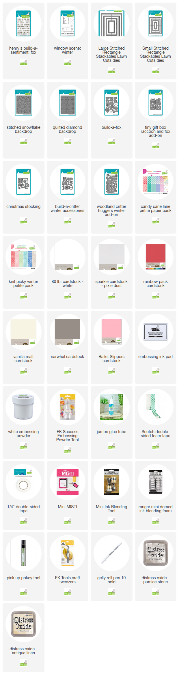 She layered this cute, decorated panel onto a Candy Cane Lane Stitched Rectangle, then onto a Stitched Snowflake Backdrop panel. Then she finished the card with a sentiment combining Henry’s Build-A-Sentiment: Fox and Window Scene: Winter.