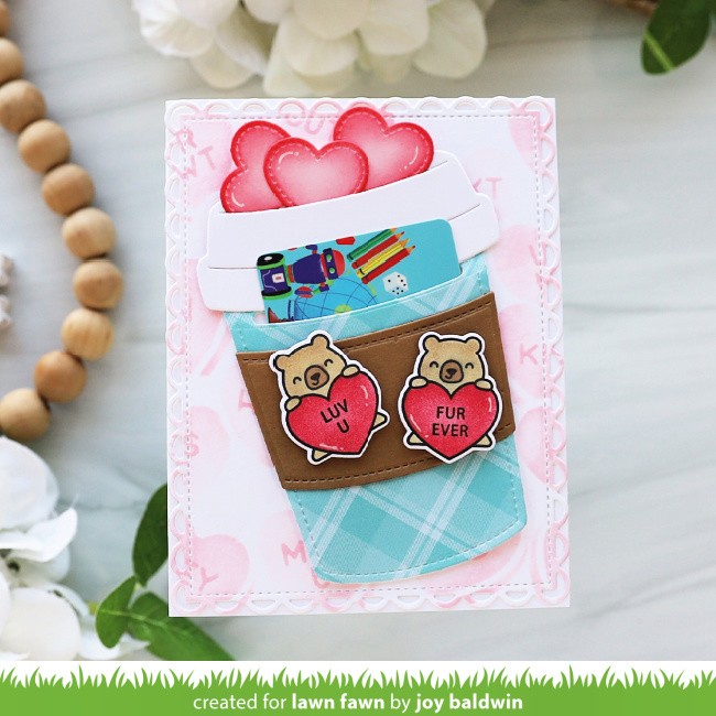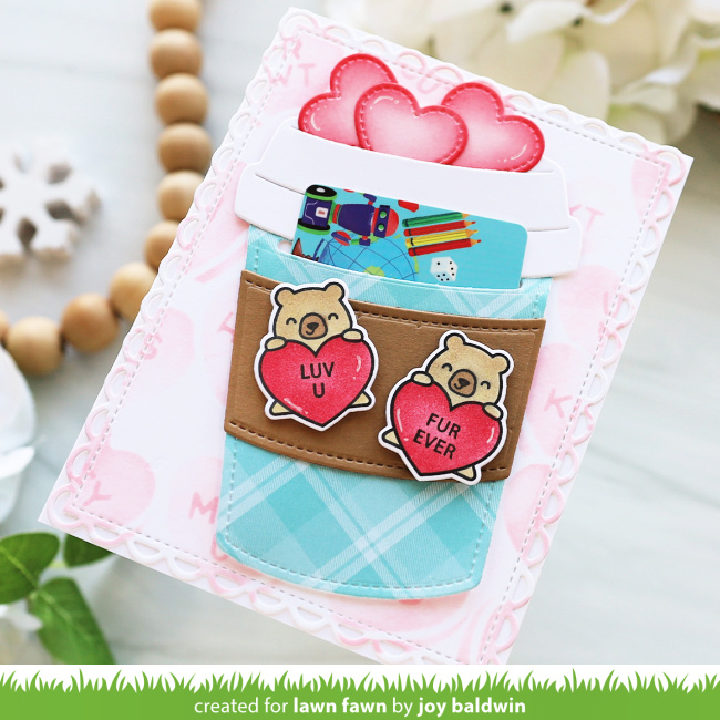 For the background, Joy inked the Candy Hearts Stencils on a Lacy Rectangle. The subtle design is so pretty! Then she cut the coffee cup from Favorite Flannel patterned paper and she cut the lid from white and the sleeve from Paper Bag cardstock.