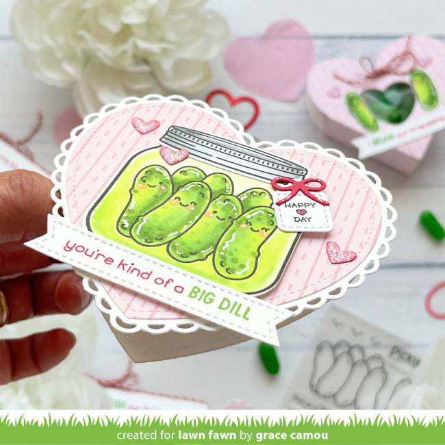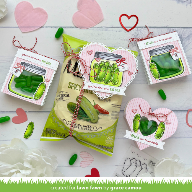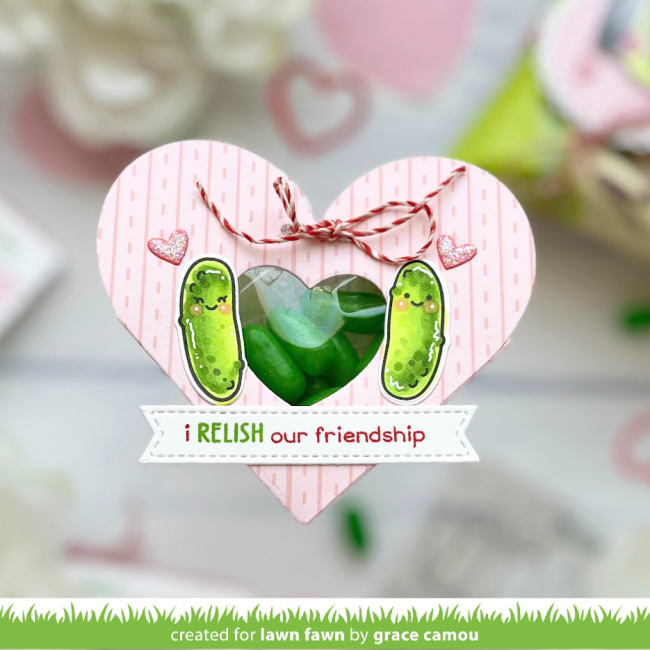 For this delightful little treat, Grace used Heart Pouch, cutting a heart window so the Mike and Ike Sour Watermelon candies show through. Using Peppermint Cord, she tied the pouch closed. Then she embellished with a cute pair of pickles, before adding the sentiment as on the card above.
