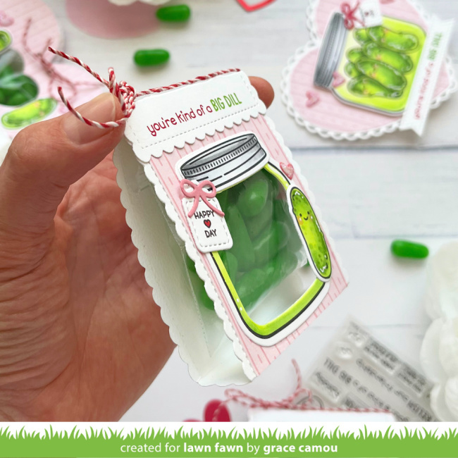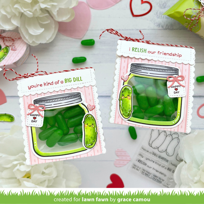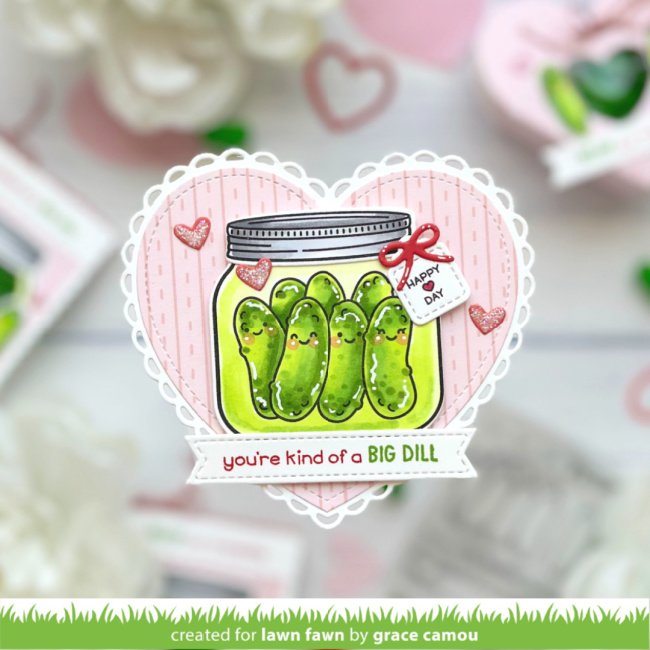 She stamped and colored the jar from How You Bean with the pickles from the add-on set, using bright yellow green! Then she added the bow and tag from Build-A-Drink Mason Jar Add-On with a saying from Special Delivery. Finally, she stamped the punny greeting on a Stitched Sentiment Banner in Lobster and Jalapeño Lawn Fawn ink.