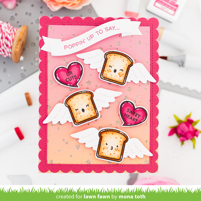 Mona‘s whimsical design combines wings from Build-A-Critter Valentine Accessories with Let’s Toast! She added faces on the toast from Christmas Fishes. Then she paired A Mole Lot of Love heart bubbles with sayings from Critter Conversation Hearts.