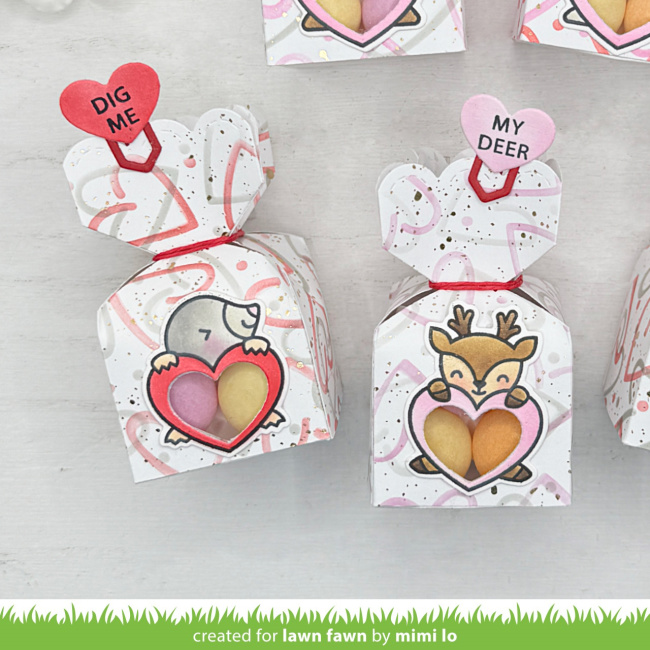 Then she stamped, colored with coordinating Coloring Stencils and die cut the Critter Conversation Hearts before using the same Little Letter heart to cut a window. She reserved the heart cut out, to stamp the punny sentiments before adding them to the Paper Clips and positioned the critters on the boxes.