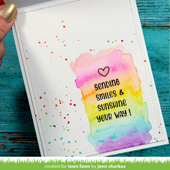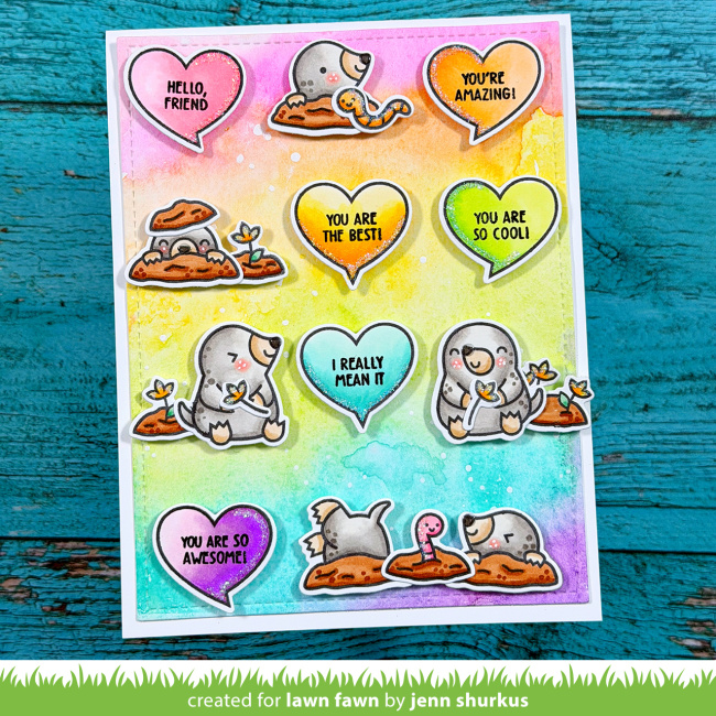 Jenn‘s grid design is so clever and colorful featuring A Mole Lot of Love and A Mole Lot of Love Add-On! She used Distress Watercolor Pencils to create a colorful wash of rainbow color on Distress Watercolor Cardstock.