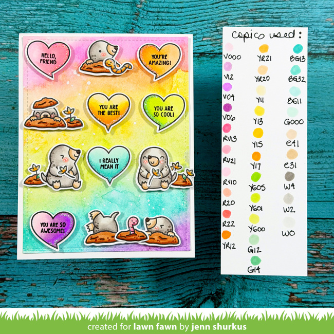 Jenn also shares the Copic colors she used to coordinate with her rainbow background!
