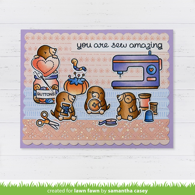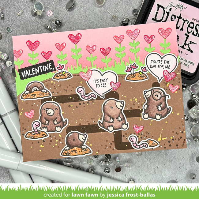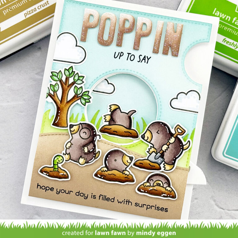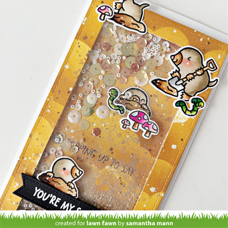Samantha is with us today sharing the cutest shaker card featuring A Mole Lot of Love! Her tall slimline design has lots of room for cute critter antics! You can watch the video tutorial below or click HERE to watch at our YouTube channel. Thank you so much for watching! Samantha crafted her fun card design on a Large Slimline with Sliders panel. She stenciled it with a cloud pattern to look like mounds…