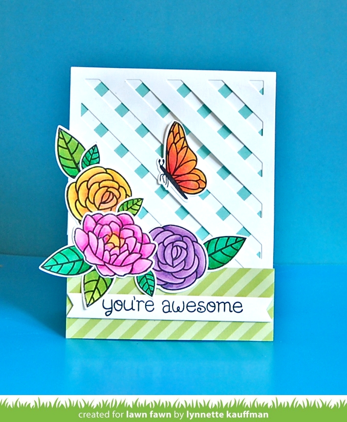 Lynnette‘s Flutter By flowers and butterfly look gorgeous on her pretty lattice created with Stripey Backdrop! I love the richness of the beautifully colored flowers!
