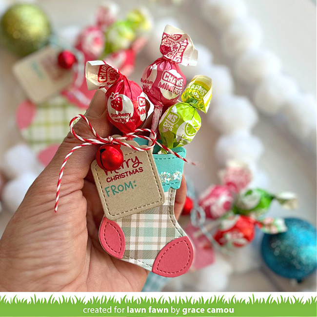 Grace created adorable tags to dress up her gift packages using Christmas Stocking, Favorite Flannel Fall papers and colorful cardstock.