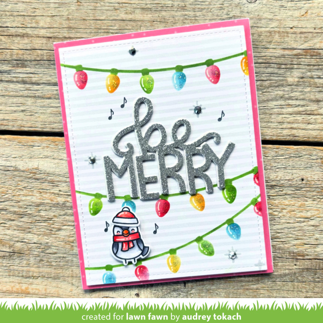 Audrey‘s Christmas card is so colorful and fun! She stenciled the String of Lights on the All the Sparkles background before adding the sparkly silver Giant Be Merry. And of course, the cute Winter Bird adds a bit of whimsy!