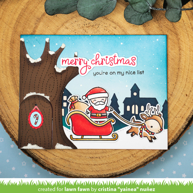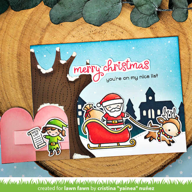 Yainea created an interactive card with Knock Knock, Who’s There! Her happy holiday scene features Ho-Ho-Holidays, Village Hillside Border and the Knock Knock Who’s There Tree Add-On!