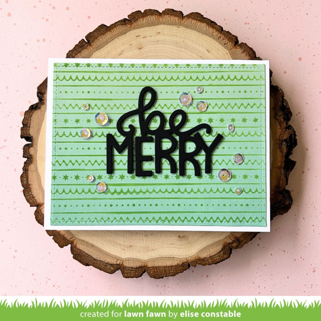 Elise created a simply delightful holiday card with a Cozy Sweater stenciled background and Giant Be Merry! A few scattered sequins add just the right amount of sparkle!