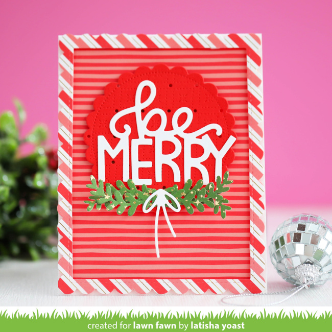 I love how Latisha combined Giant Be Merry with the coordinating die from Big Messages: Christmas! It’s the perfect layer in bright red! Then she added Christmas Garland and a Stitched Scalloped Rectangle Frame in pretty Candy Cane Lane striped paper!