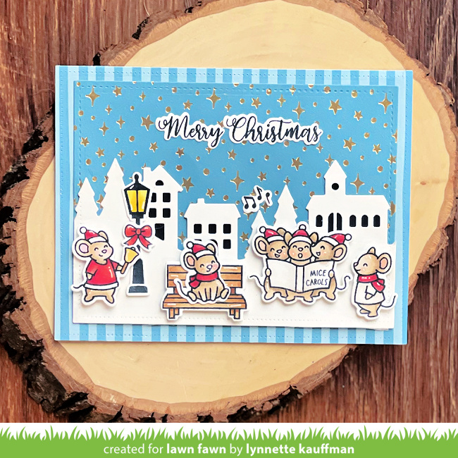 Lynnette created a charming background for the Caroling Mice using Village Hillside Border and All the Sparkle paper! Then she added the die-cut sentiment from All the Santa Hats!