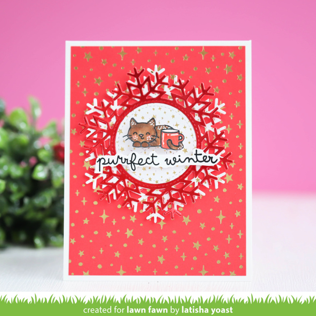 Latisha‘s card couldn’t be more charming! I love how she framed the Cozy Cat with a Magic Iris Snowflake Add-On! And the All the Sparkles papers make her simple design so special!