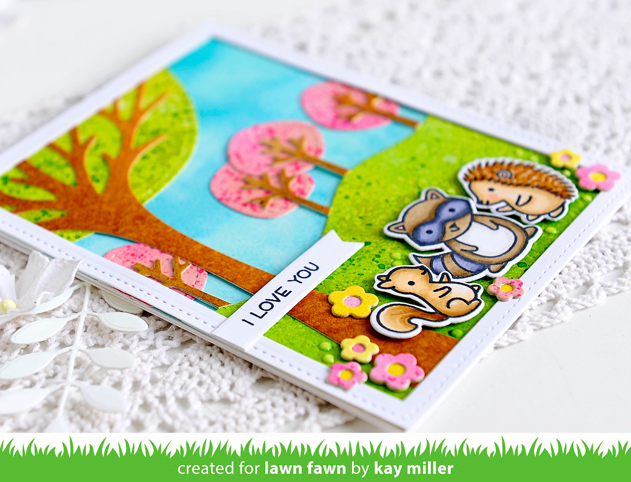 Kay used Distress Ink blending and splattering to achieve that awesome colorful texture on the Stitched Tree Borders and Leafy Tree Backdrop!